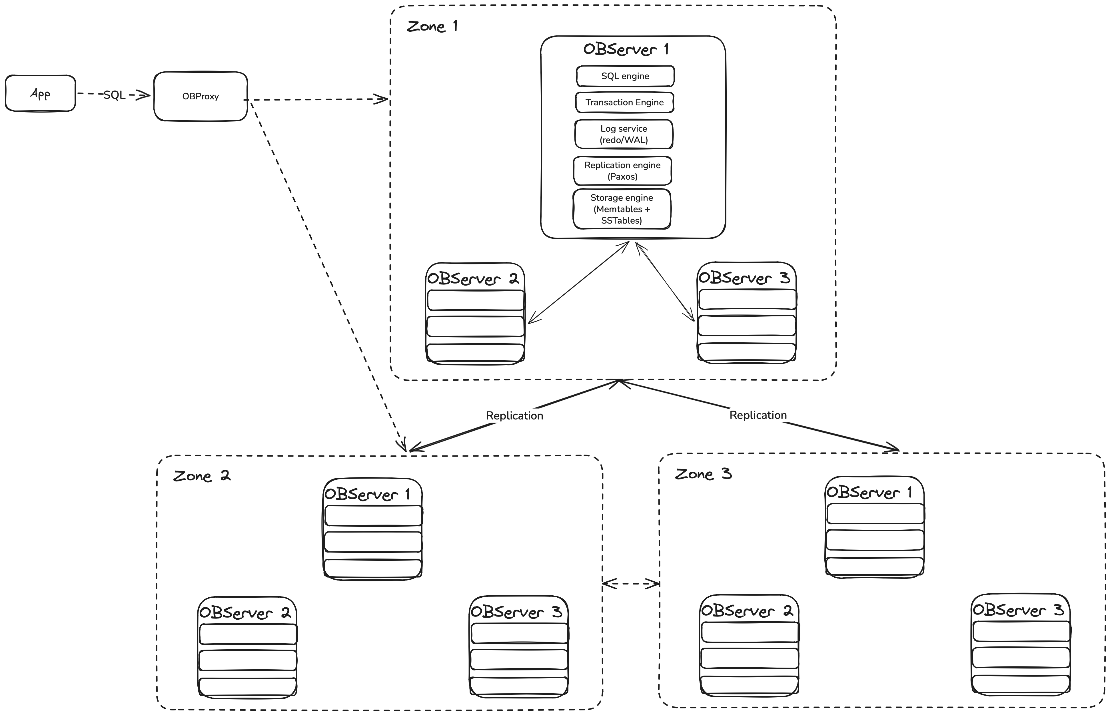 OceanBase DB documentations uses a lot of terms like OBServers, OBProxy, Zone and much more. These three components defines how an OceanBase cluster is physically organized. Let's start from the OBServer.